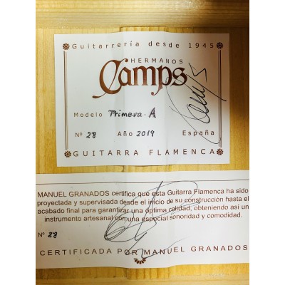 Como otras de las guitarras construidas por Camps, este modelo flamenco ha contado con la supervisión del concertista Manuel Granados, asegurándose de que cada pieza alcanza el máximo nivel de rendimiento y que transmite todo lo que un instrumento como este es capaz de ofrecer.