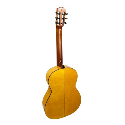 Mayor cuerpo sonoro gracias a su tapa de cedro. Perfecta para comparsas y actuaciones. Sonido con más graves, volumen y profundidad sin perder el carácter flamenco.